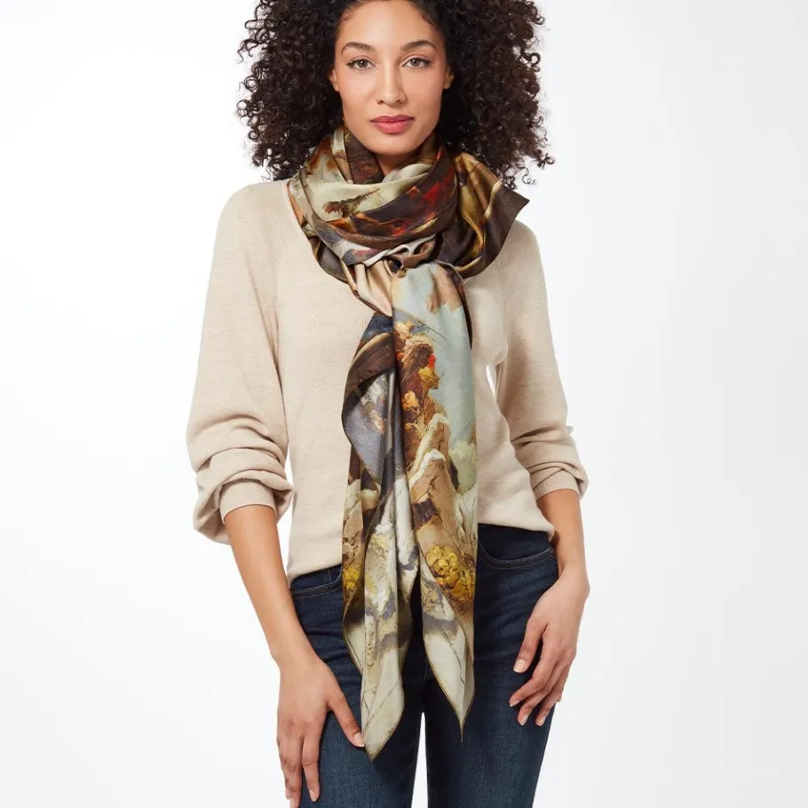 Bring the drama with this artful scarf featuring a fabulous tableau by the great Giovanni Battista Tiepolo (Italian, 1696–1770). Regarded as the first master of the Grand Manner—a style of painting then celebrated for its idealized, often Classical motifs—Tiepolo was arguably the most outstanding painter of 18th-century Europe. Allegory of the Planets and Continents (1752) ranks among his largest and most dazzling oil sketches, in which a radiant Apollo, the god of light, is set to launch on his daily course across the sky. The deities around Apollo symbolize the planets, while the allegorical figures on the cornice represent the “four continents,” which included Europe, Africa, Asia, and America at the time. Tiepolo presented this…See More