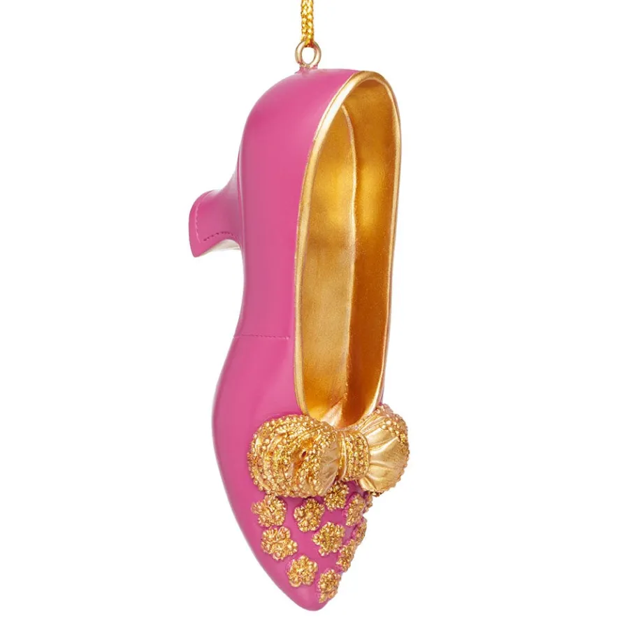 This stylish ornament reimagines a pair of British evening slippers (ca. 1897) by the upscale London firm Hook, Knowles & Company, whose elite clientele included the British royal family. Presented in an eye-catching purple color, our ornament references the novel beadwork design and meticulously trimmed bow that serve as hallmarks of quality on the original shoes.